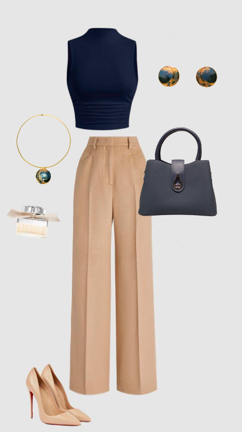 High-waisted camel pants + fitted navy blue top Accessories: Turquoise blue circular earrings, gold ring, gray structured bag and nude heels.